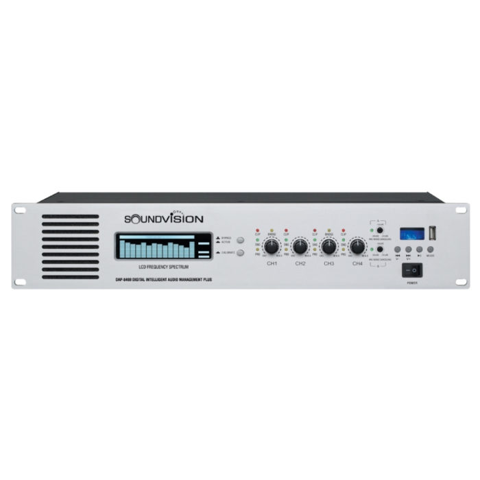 Soundvision DAP-8400 เป็นเพาเวอร์แอมป์ที่มีอินพุตไมโครโฟน 8 ช่องอินพุตทุก 4 ช่องแบ่งเป็น Area A และ Area B สองช่องแยกกัน โดย Auto Mixer ทำงานด้วย Mic Noise Canceling และ Auto Room Calibrate ทำงานร่วมกับ Digital Feedback Suppression สามารถแยกการเข้าถึงได้ตามความต้องการของโอกาสต่างๆ รองรับการประชุมหลายห้องสำหรับห้องประชุมองค์กร ห้องประชุมของรัฐบาลและการประชุมสภาเมือง สถาบันการศึกษา